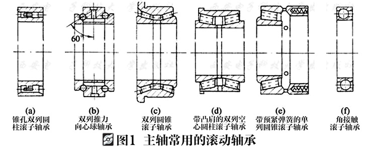 滾動軸承摩擦阻力小,可以預緊,潤滑維護簡單,能在一定的轉(zhuǎn)速范圍和載荷變動范圍內(nèi)穩(wěn)定地工作。滾動軸承由專業(yè)化工廠生產(chǎn),選購維修方便,在數(shù)控機床上被廣泛采用。但與滑動軸承相比,滾動軸承的噪聲大,滾動體數(shù)目有限,剛度是變化的,抗振性略差并且對轉(zhuǎn)速有很大的限制。數(shù)控機床主軸組件在有可能的條件下,應盡量使用滾動軸承,特別是大多數(shù)立式主軸和主軸裝在套筒內(nèi)能夠作軸向移動的主軸,這時滾動軸承可以用潤滑脂潤滑以避免漏油。圖1為主軸常用的滾動軸承類型。